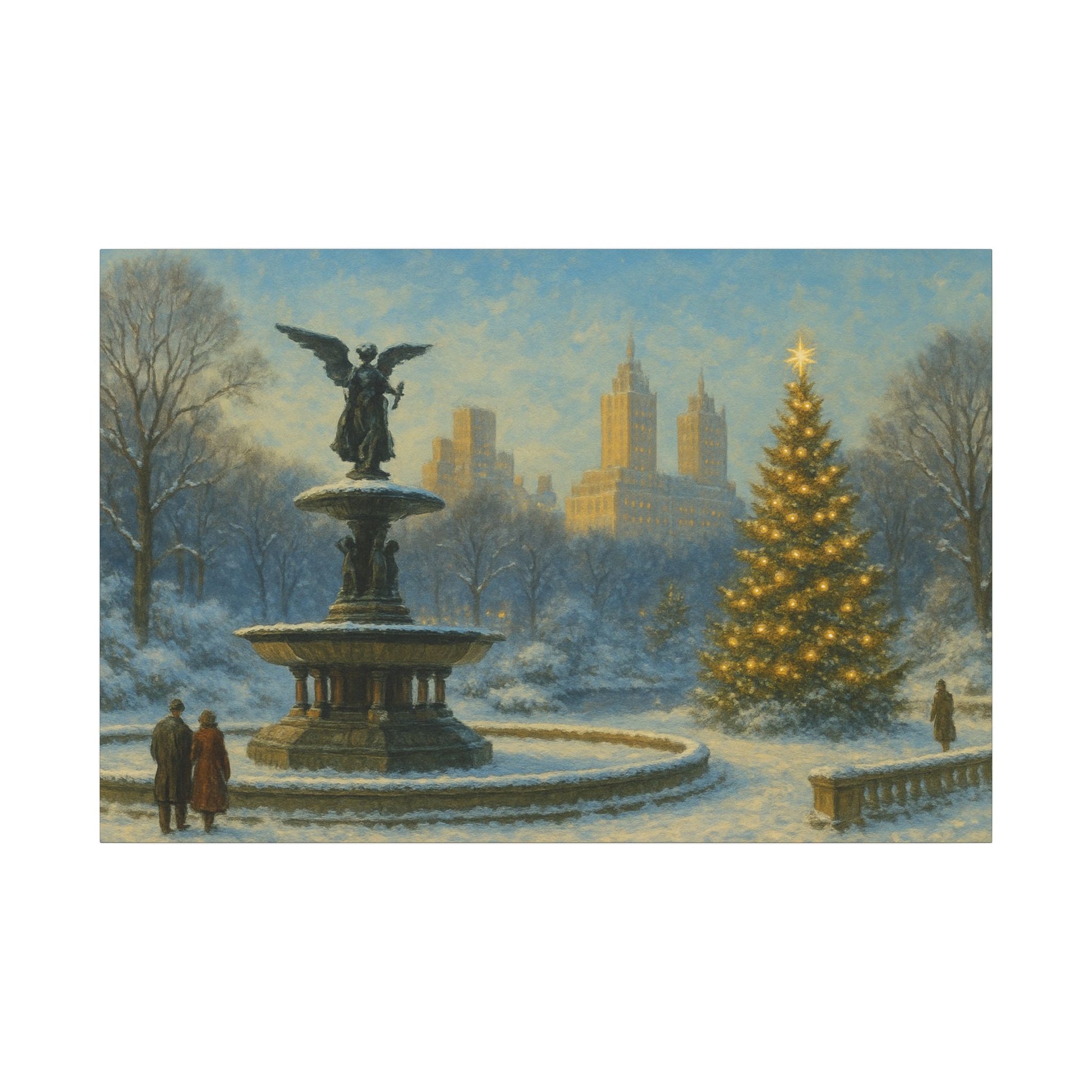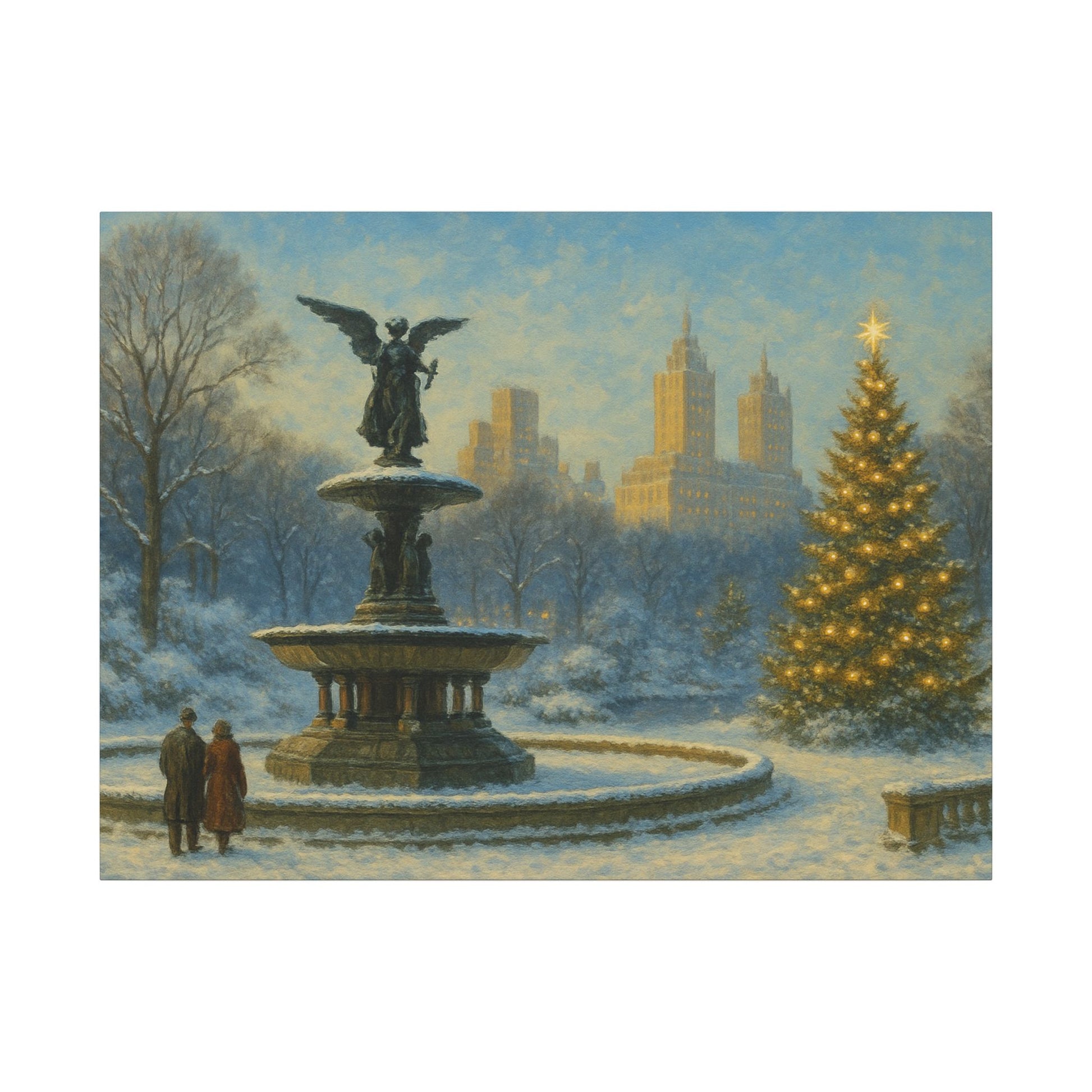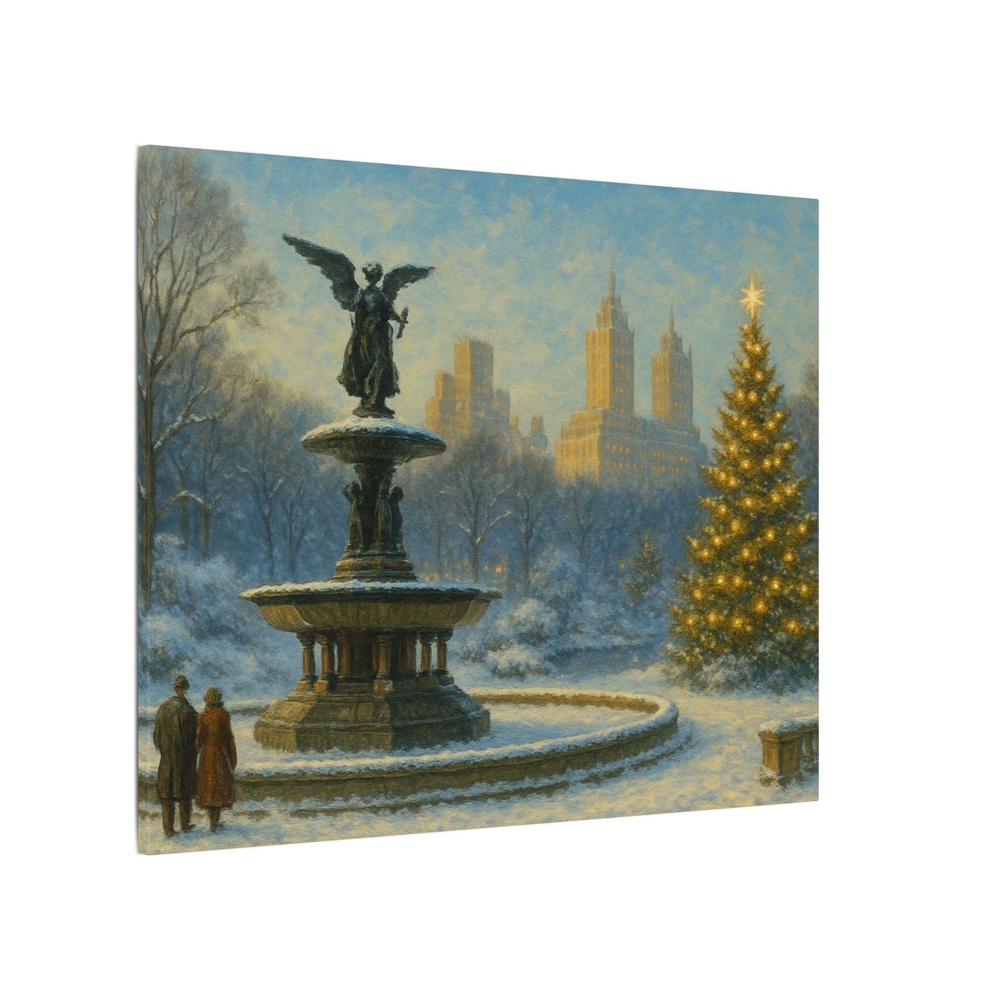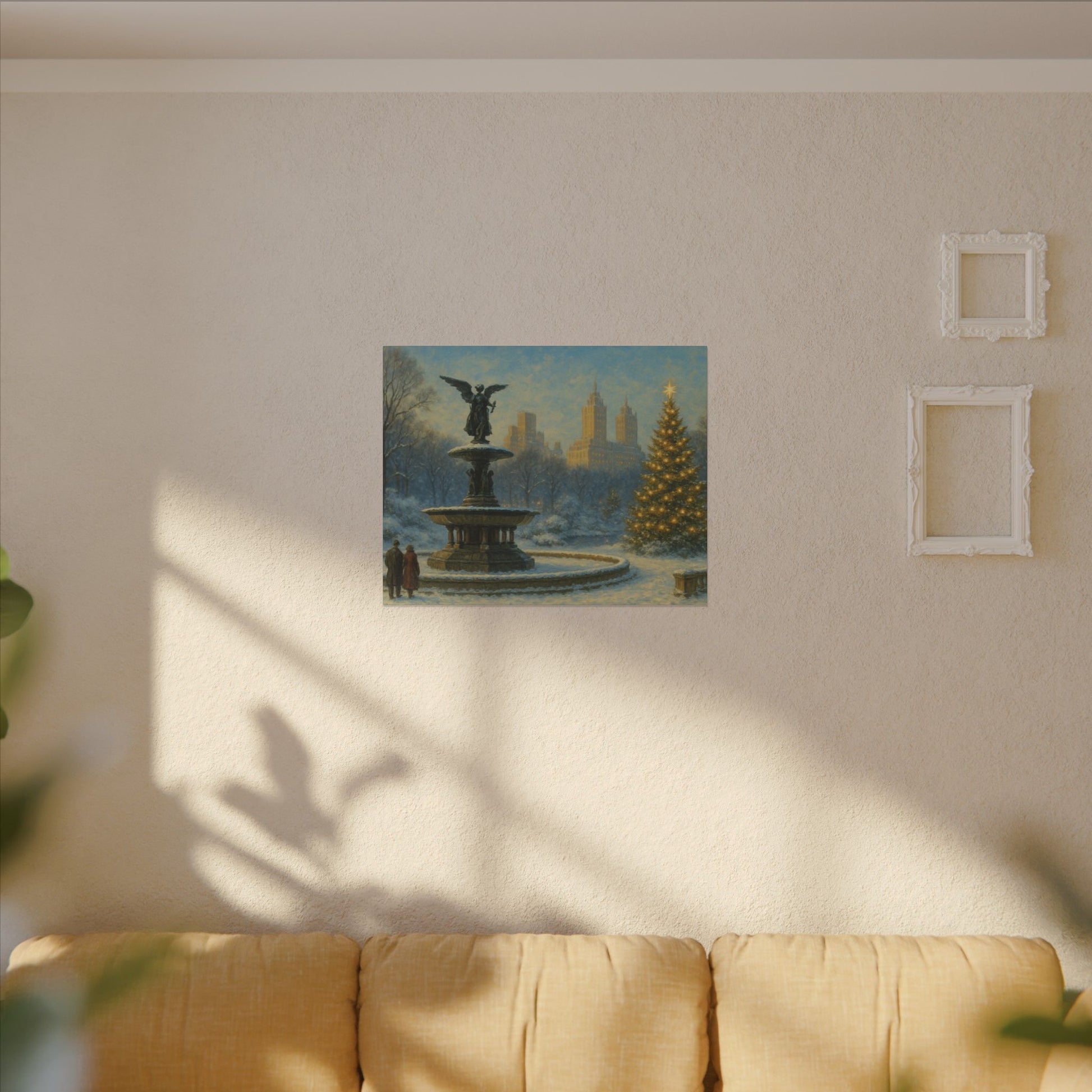 This timeless vintage oil style painting showcases Bethesda Terrace dressed for Christmas, overlooking a festive evergreen glowing beneath soft snowfall. With warm golden lights, iconic stone arches, and a serene winter setting, this artwork captures the romance and nostalgia of Christmas in Central Park. A softly lit winter evening captured on stretched matte canvas — an intimate city-park scene with a glowing Christmas tree, a graceful fountain topped by an angel, and distant skyline silhouettes. The texture of the canvas and the matte finish lend a painterly, museum-quality look that feels like a quiet stroll through snow-dusted paths. Warm golden lights against cool winter blues create depth and atmosphere, inviting a calm, reflective mood. This piece fits naturally above a mantel, in a cozy reading nook, or on a hallway wall where the glow of the tree and the subtle brush-like details can be appreciated up close. The durable cotton-poly canvas and responsibly sourced pine stretcher ensure the artwork stays vibrant and stable for years, while small rubber pads keep it sitting flush and secure when displayed. Each reproduction features premium archival color and painterly texture. Available in multiple sizes.