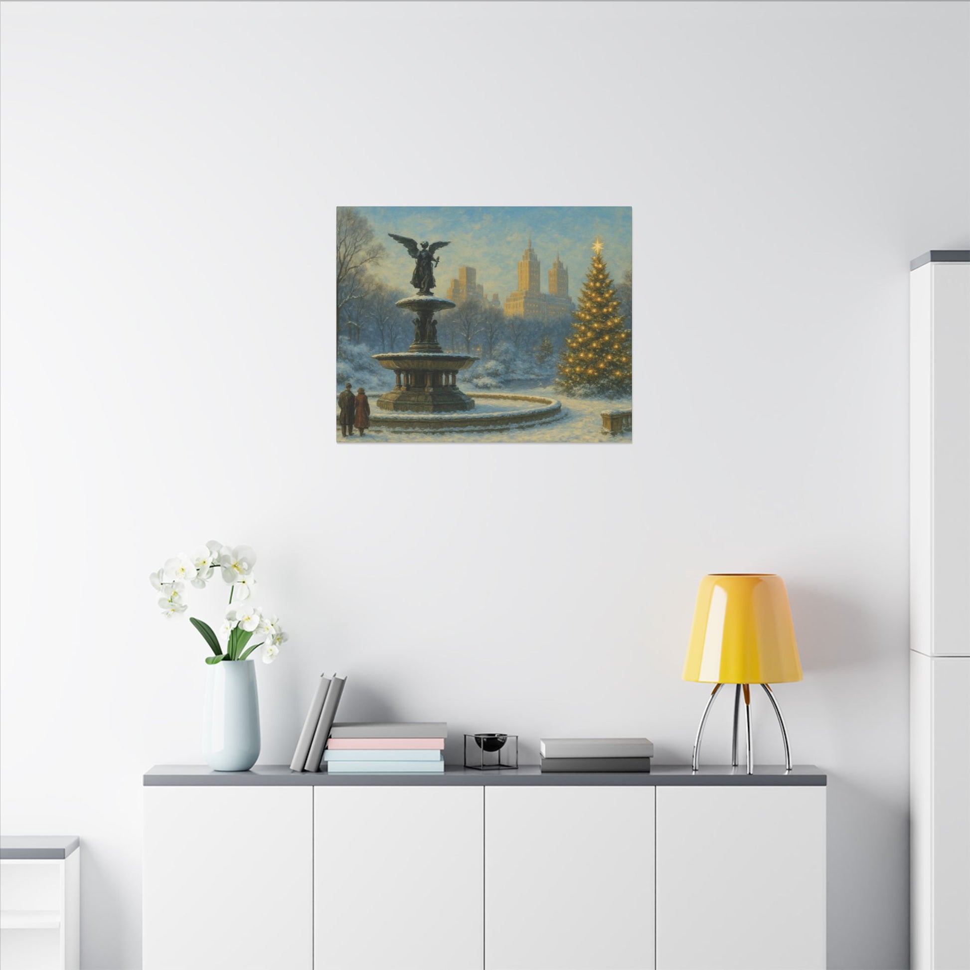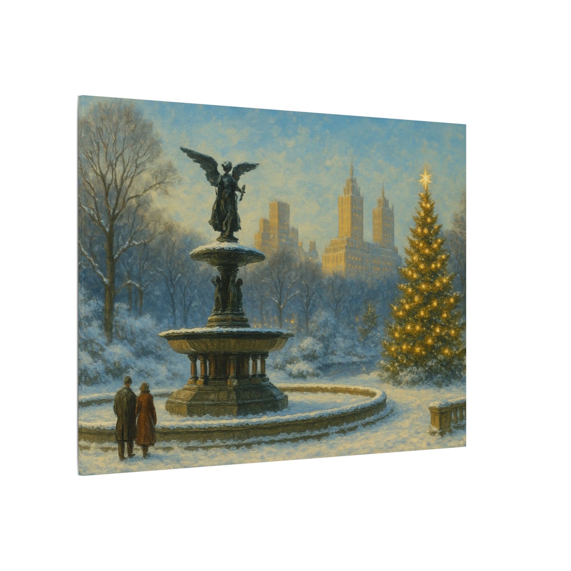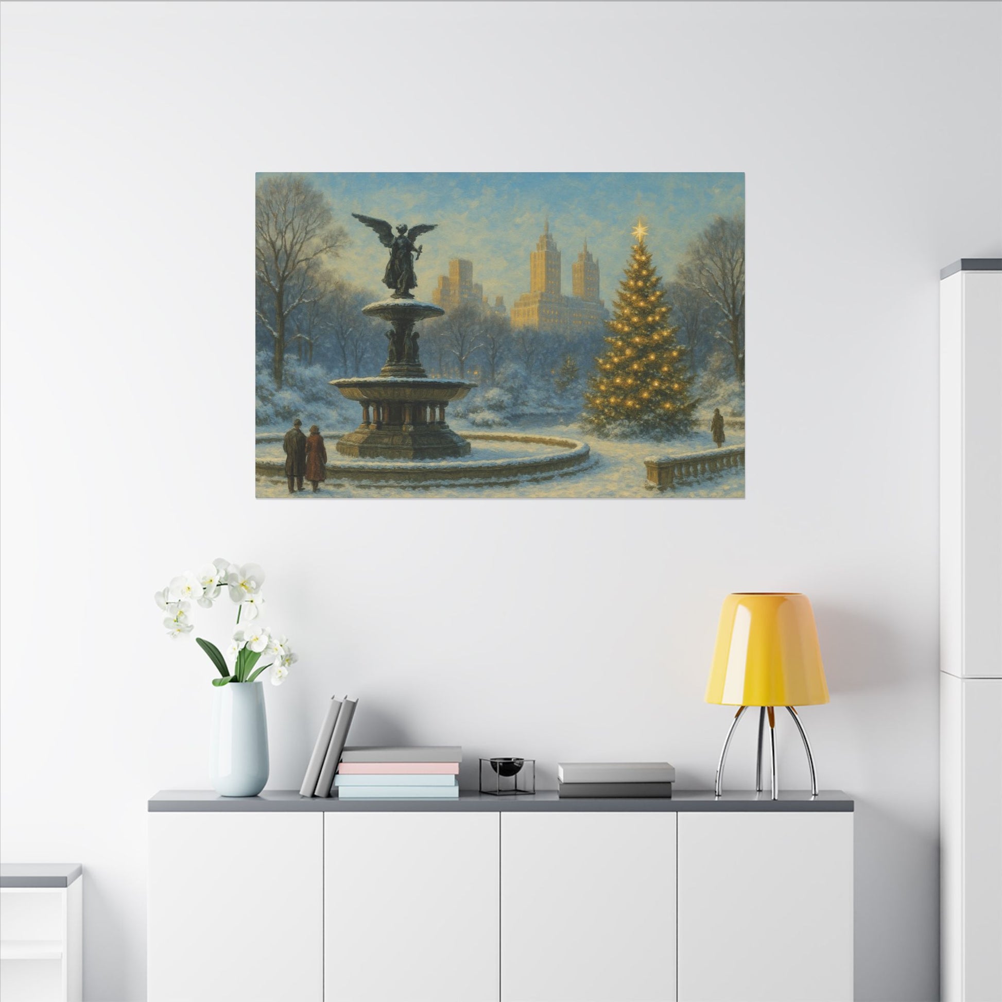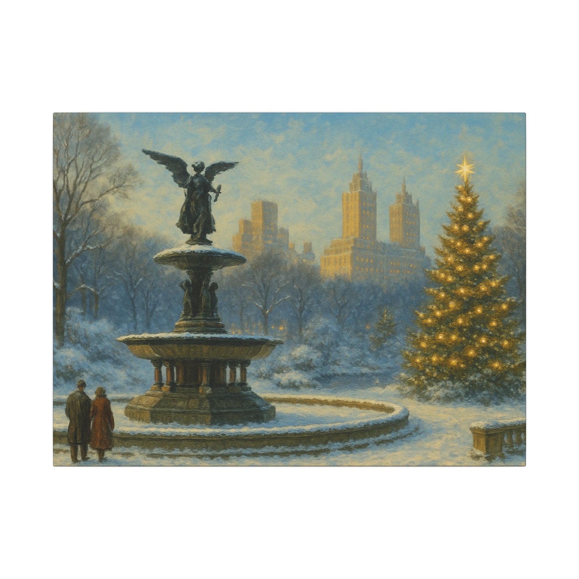 This timeless vintage oil style painting showcases Bethesda Terrace dressed for Christmas, overlooking a festive evergreen glowing beneath soft snowfall. With warm golden lights, iconic stone arches, and a serene winter setting, this artwork captures the romance and nostalgia of Christmas in Central Park. A softly lit winter evening captured on stretched matte canvas — an intimate city-park scene with a glowing Christmas tree, a graceful fountain topped by an angel, and distant skyline silhouettes. The texture of the canvas and the matte finish lend a painterly, museum-quality look that feels like a quiet stroll through snow-dusted paths. Warm golden lights against cool winter blues create depth and atmosphere, inviting a calm, reflective mood. This piece fits naturally above a mantel, in a cozy reading nook, or on a hallway wall where the glow of the tree and the subtle brush-like details can be appreciated up close. The durable cotton-poly canvas and responsibly sourced pine stretcher ensure the artwork stays vibrant and stable for years, while small rubber pads keep it sitting flush and secure when displayed. Each reproduction features premium archival color and painterly texture. Available in multiple sizes.
