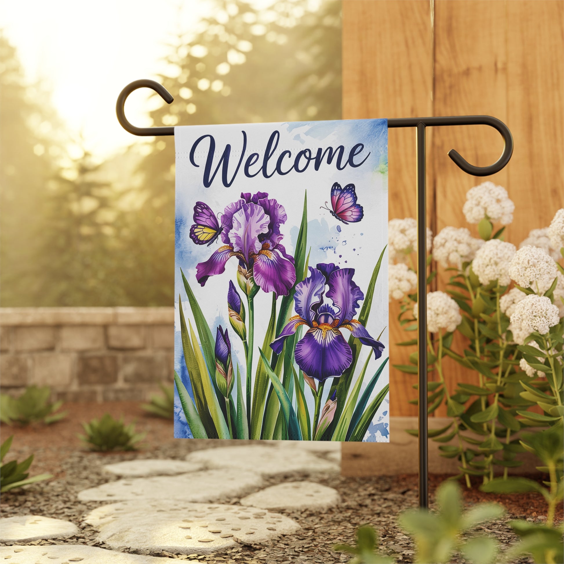 Create a warm and inviting entrance with this Welcome Iris Garden Flag, featuring graceful purple irises, lush green foliage, and delicate butterflies against a soft watercolor background. The flowing “Welcome” script adds a timeless touch, making this flag ideal for front yards, gardens, porches, walkways, and patios.