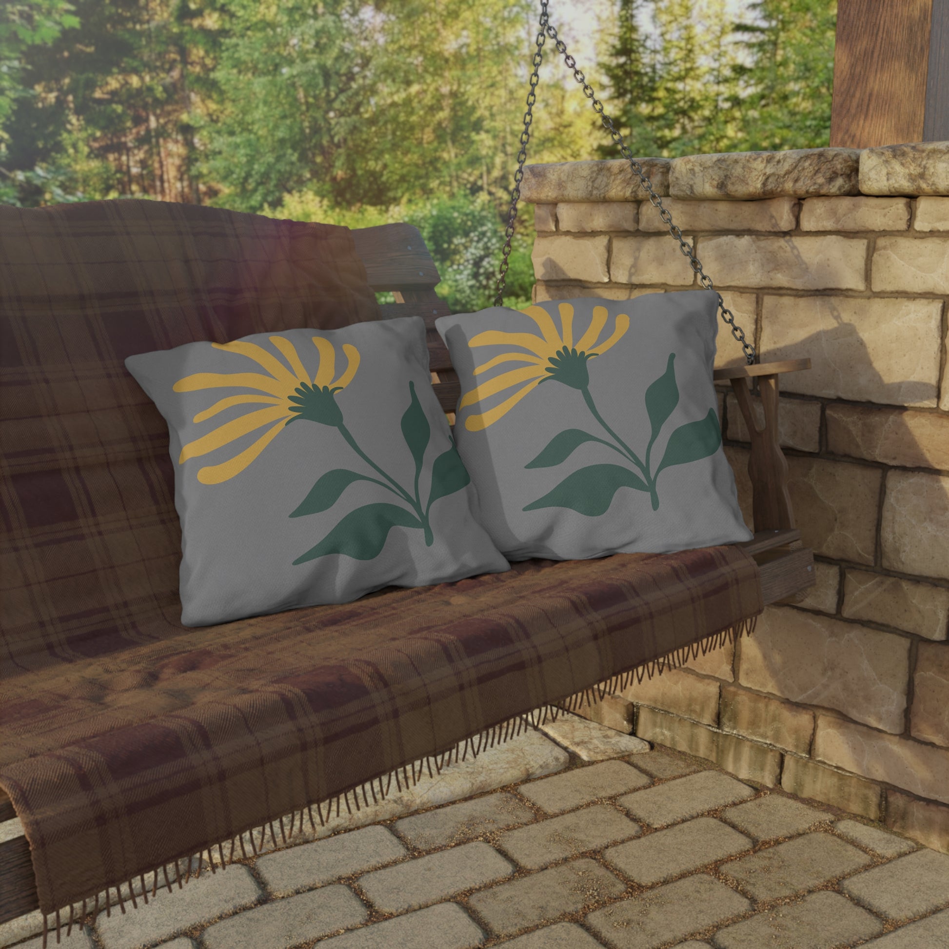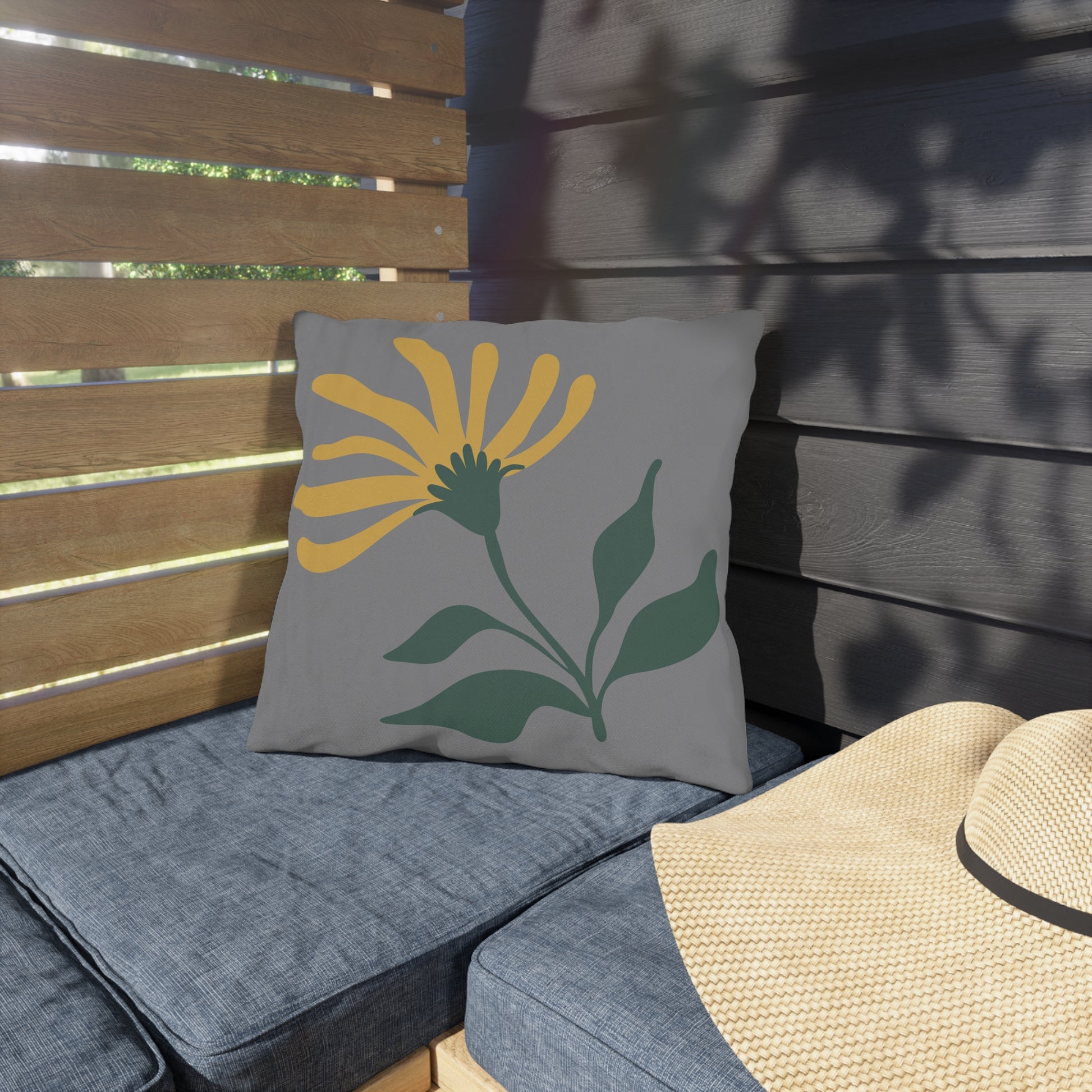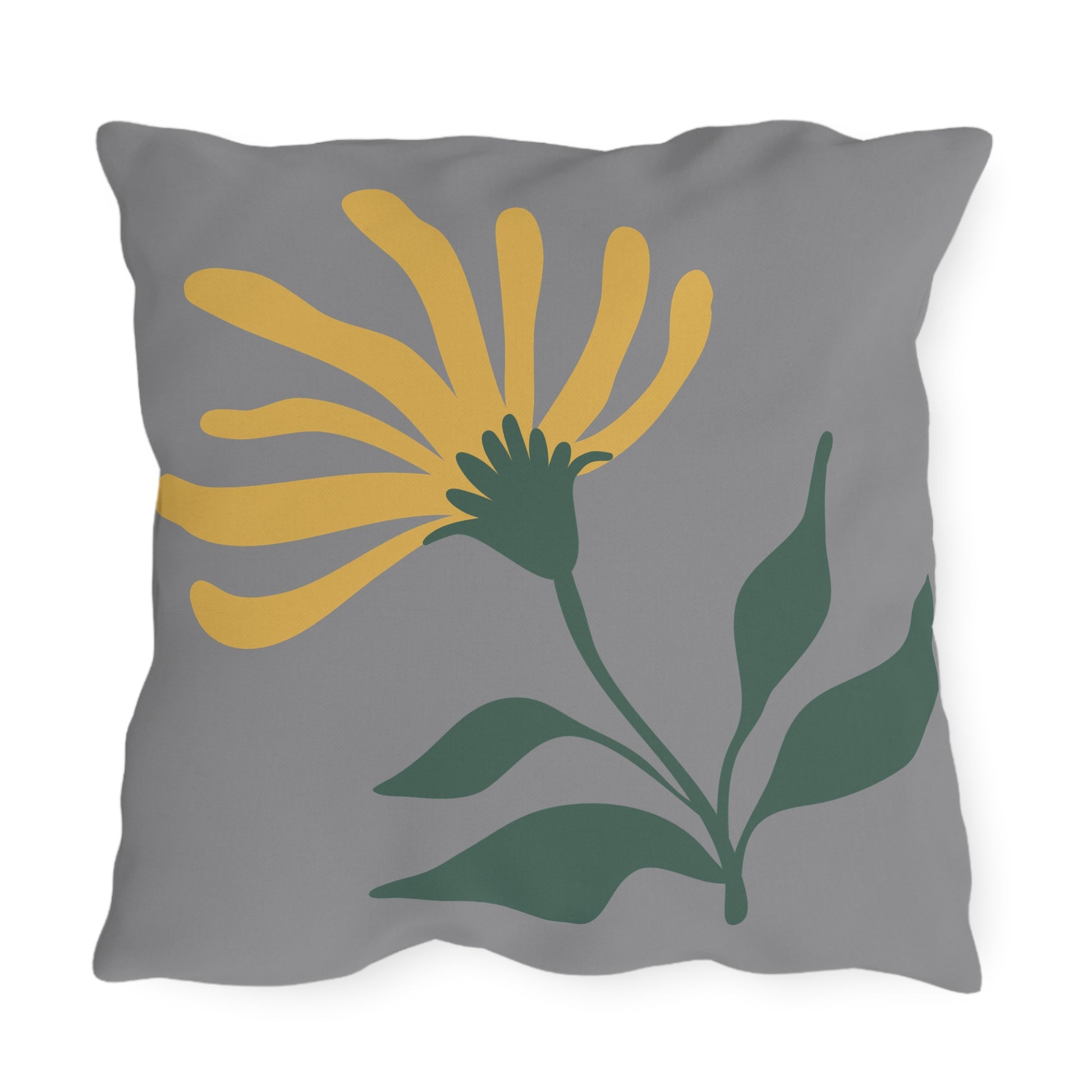 This outdoor pillow features a yellow flower design on a gray background, bringing a touch of nature and brightness to any outdoor space. Perfect for those who love to spend time in their backyard, patio, or garden. Ideal for decorating outdoor furniture during spring and summer.